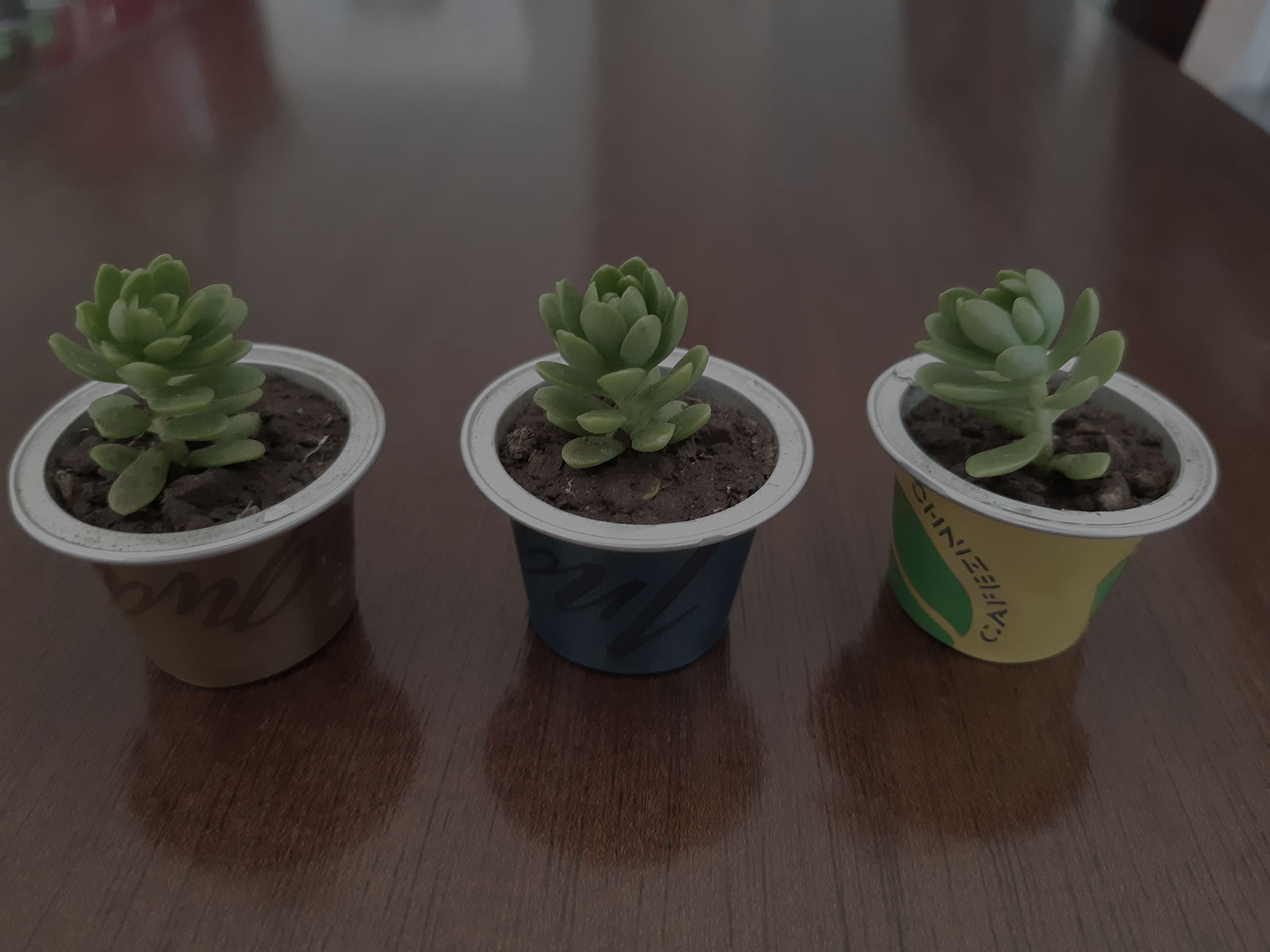 Maceteros sustentables hechos con cápsulas de café reutilizadas.